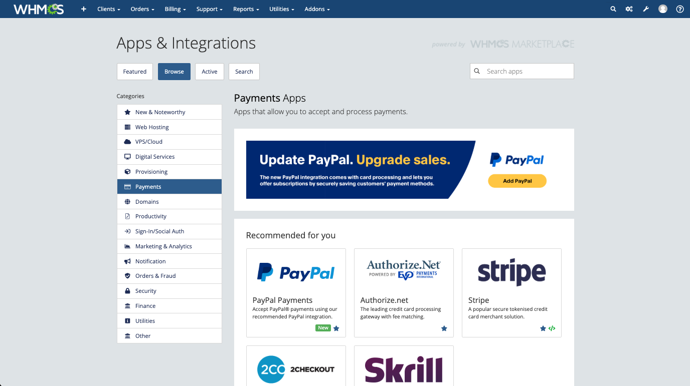 درگاههای پرداخت یا Payment Gateway مانند PayPal یا درگاههای بانکی داخلی و خارجی دیگر، به شما در انجام فرایند پرداخت کمک زیادی میکنند. شما در WHMCS میتوانید از انواع درگاههای پرداخت استفاده کنید و همچنین میتوانید انواع عملیاتهای مرتبط به پرداخت، برگشت وجه و یا یکتا بودن هر پرداخت را در اینجا داشته باشید.